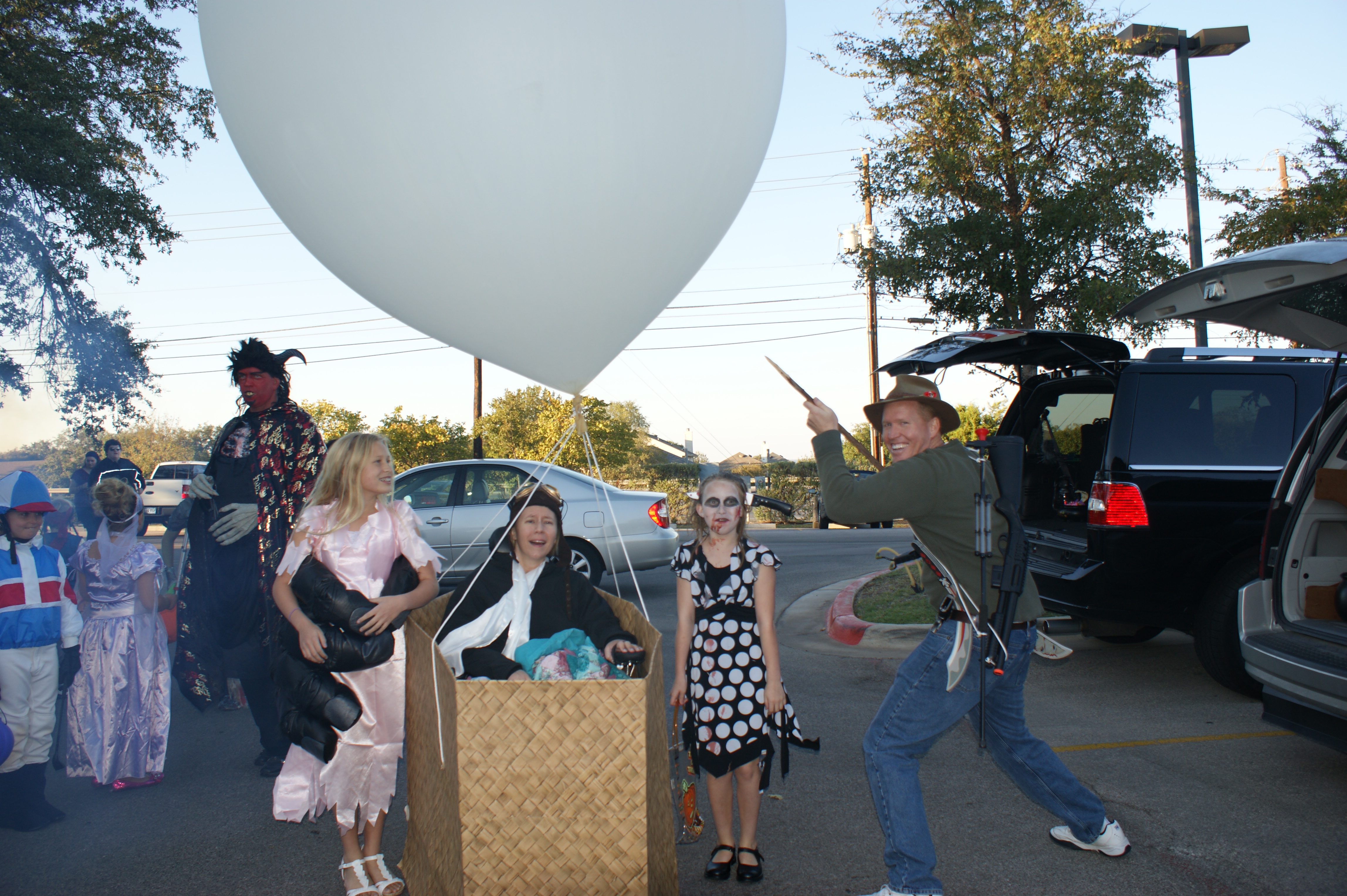 WE HAD TRUNK OR TREAT FRI. NIGHT THE 28TH). SOPH WAS A ZOMBIE, JESS WAS FEY RAY FROM KING KONG, I WAS A HOT AIR BALLOON PILOT, & MK WENT WITH EVERYTHING THAT COULD POP A BALLOON (HE HAD DARTS, A SHARP STICK, A SWORD, A SLINGSHOT…) ZACH WAS GONE (DARN HS TENNIS TEAM! THOUGH EARLIER THIS MONTH, HE ATTENDED A HALLOWEEN DANCE AS SOME KIND OF DISCO DUDE, W/AN AFRO, & A SHIRT THAT LIT UP, ACCORDING 2 THE BEAT OF THE MUSIC.)