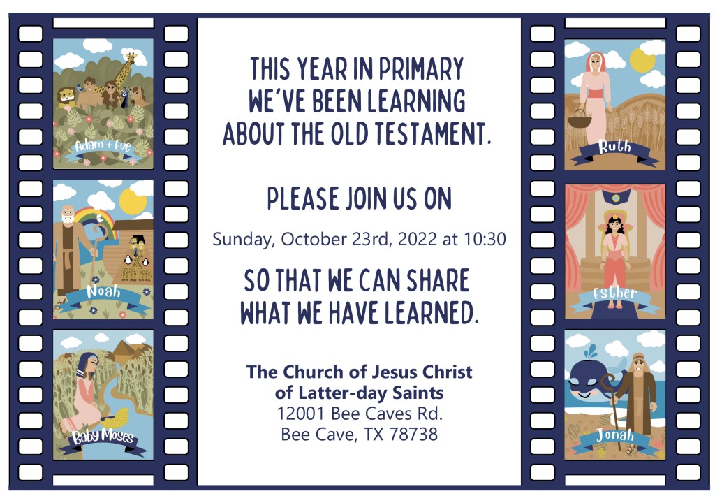 On October 23rd the Bee Cave ward (12001 Bee Caves Rd.) will have its primary program at 10:30.  This is a wonderful opportunity to hear the children’s testimonies through word & song & let them share what they have learned this year – all are invited!  I was fortunate to assemble the program this year.  I won’t lie – it stressed me out.  But when I wrote the program last year, I learned that I like to involve the children in the process by asking them questions.  So I did that again this year, & it was very uplifting to read their responses. If u would like to hear it, but can’t come, even though the sound quality will be better in person, it will be available on zoom: